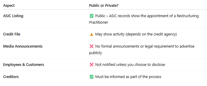 Great question — a Small Business Restructure (SBR) is not very public, especially compared to other insolvency processes like liquidation or voluntary administration. Here's a detailed explanation: