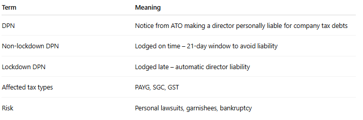 A Director Penalty Notice is a formal notice issued by the ATO to a current or former company director, making them personally liable for unpaid company tax debts.