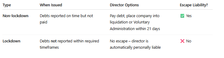 If these debts remain unpaid and unreported, the ATO can issue a DPN to directors, making them personally liable even if the company goes into liquidation or administration.