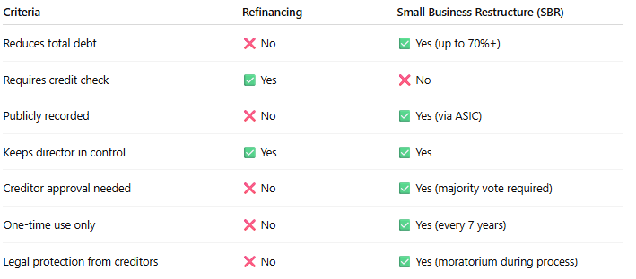When your business is facing mounting tax debt or financial pressure, it's critical to understand your options. Two common strategies are refinancing and the Small Business Restructure (SBR) process. Each has its place—depending on your business’s financial health, structure, and long-term goals.
