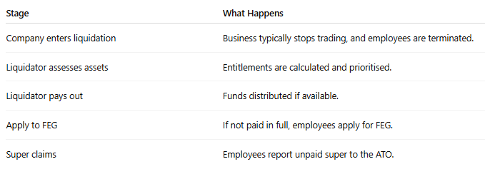 The liquidator will assess available assets and distribute funds. Employee entitlements are paid before unsecured creditors but after secured creditors (e.g. banks with registered security).Through the Fair Entitlements Guarantee (FEG)