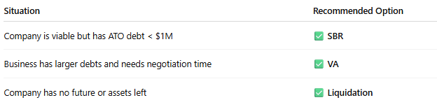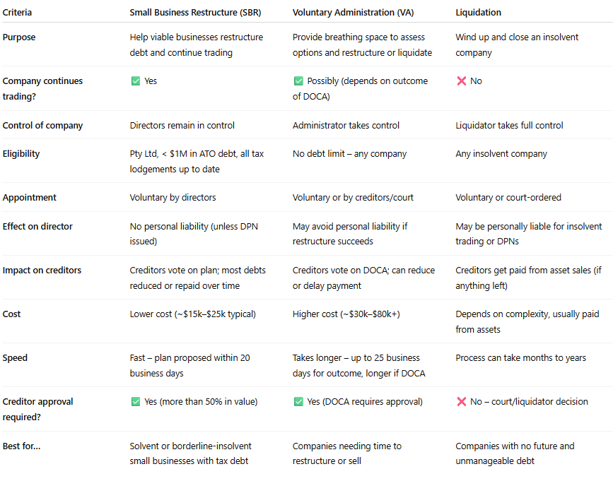 Voluntary Administration (VA) vs Liquidation vs Small Business Restructure (SBR)